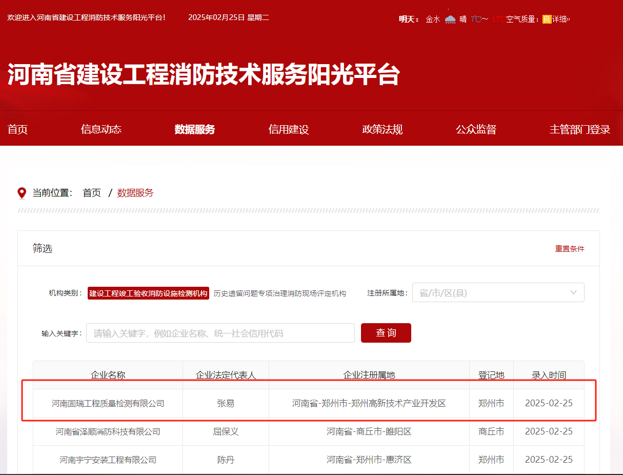 • 熱烈祝賀河南固瑞工程質(zhì)量檢測有限公司入冊河南省建設(shè)工程消防技術(shù)服務(wù)陽光平臺!!!